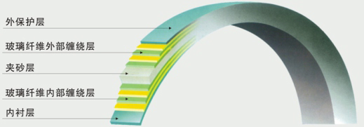 公司生產(chǎn)的玻璃鋼夾砂管道采用傳統(tǒng)的往復(fù)式定長纏繞工藝,該工藝是以樹脂為基體材料,玻璃纖維及其制品為增強(qiáng)材料,石英砂為填充材料而制成的新型復(fù)合材料。