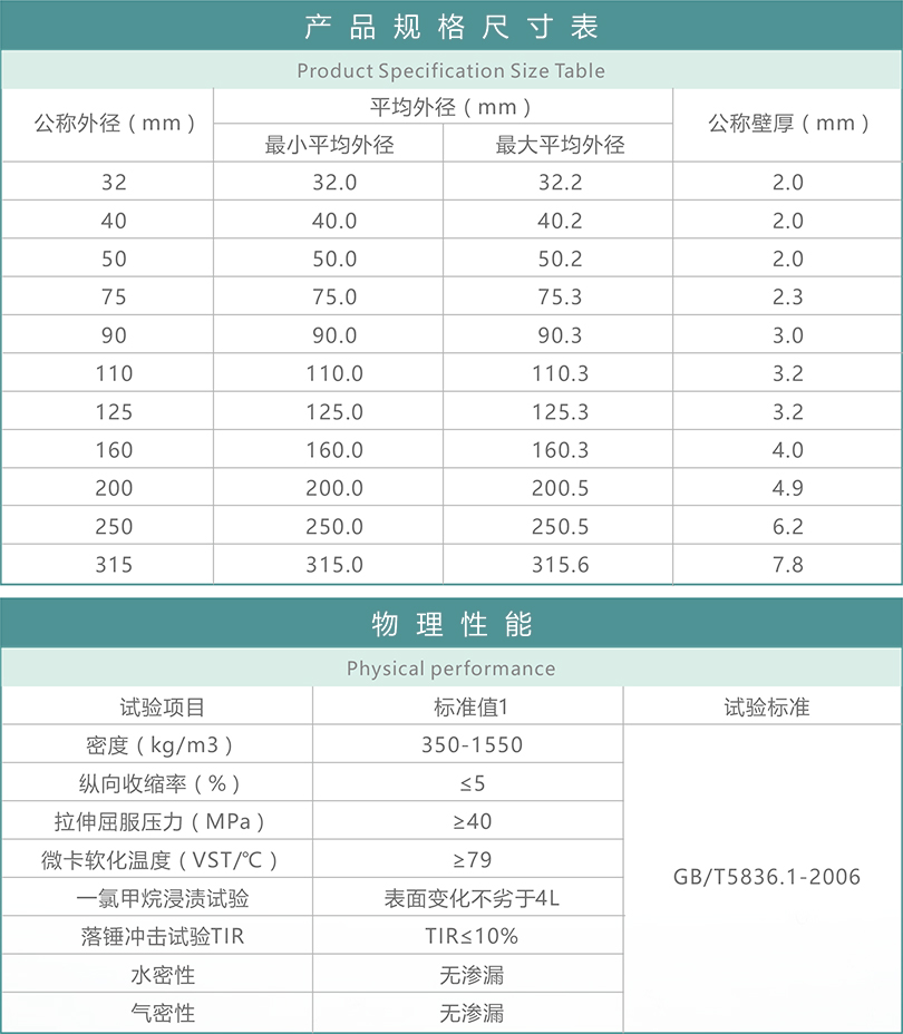 產品執行標準:GB/T5836.1-2006建筑排水用硬聚氯乙烯(PVC-U) 第 一 部 分 : 管 材G B / T 5 8 3 6 . 2 -2006建筑排水用硬聚氯乙烯(PVC-U)第一部分:管件