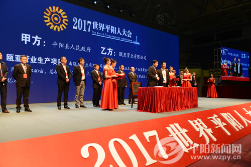 2017世界平陽人大會共安排了11個簽約項目,總投資近218億元。簽約項目涉及戰略性新興產業、總部經濟、電子商務、旅游和文化創意等各大領域,(其中含現代服務業2個(休閑旅游項目1個),總部項目2個,工業項目2個,教育類項目1個;其中百億元項目1個,30億元項目1個,5億元以上項目1個,億元以上項目4個,輕資產項目2個;其中在外平陽人回鄉投資項目6個,國內大型保險企業1個),將有力推動我縣產業結構的轉型升級,實現平陽跨越式發展。